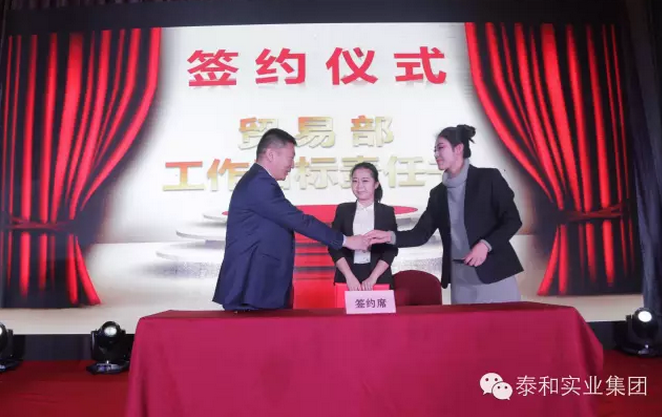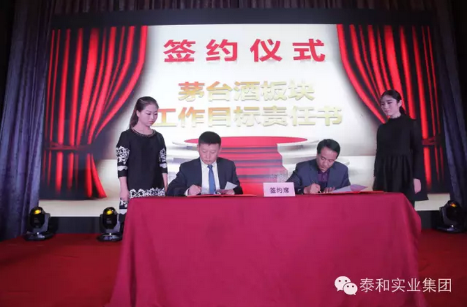 大會進行了泰和集團2016年工作目標責任書簽訂儀式,董事長分別與總經理及茅臺酒負責人簽訂了工作目標責任書;總經理分別與集團職能板塊:行政部、財務部、法務部,業務板塊:藥材交易中心、貿易、金融、格欽樓餐飲、物業各板塊負責人簽訂工作目標責任書,明確了2016年集團各部門工作目標。