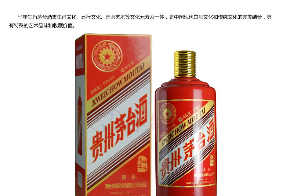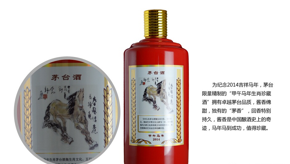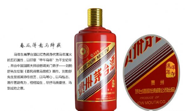馬年生肖茅臺酒以紅色瓶身代表馬年屬火的五行屬性,以印章“甲午馬年”為干支紀年,并由中國國畫大師徐悲鴻關門弟子--劉勃舒先生繪制《春風得意馬蹄疾》畫作。劉勃舒先生發揚其師傳技藝,以馬寫心,以馬弘志。畫作蒼勁有力,栩栩如生,盡抒馬騰盛世、馬到成功之意。