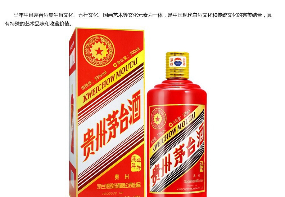 馬年生肖茅臺酒集生肖文化、五行文化、國畫藝術(shù)等文化元素為一體,是中國現(xiàn)代白酒文化和傳統(tǒng)文化的完美結(jié)合,具有特殊的藝術(shù)品味和收藏價(jià)值。
