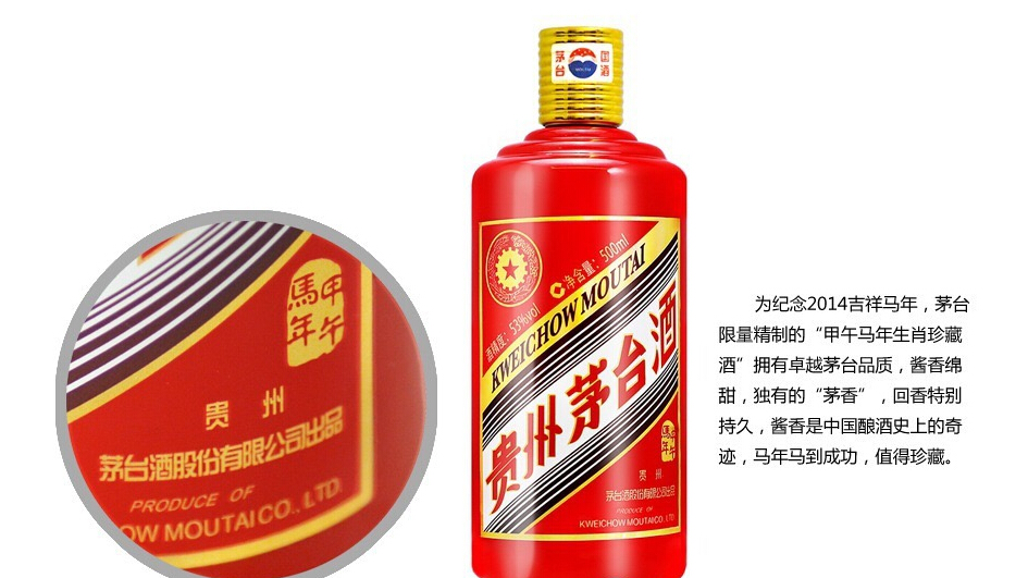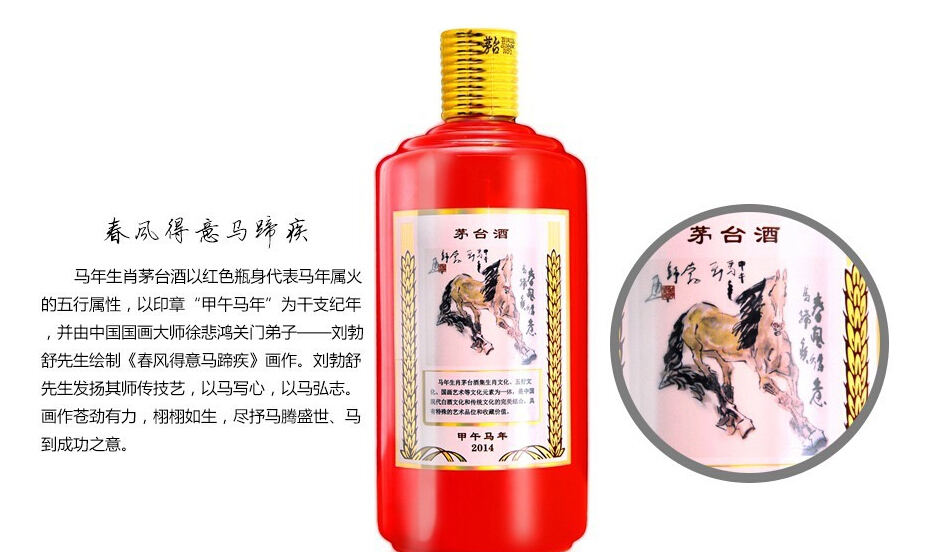 馬年生肖茅臺酒以紅色瓶身代表馬年屬火的五行屬性,以印章“甲午馬年”為干支紀(jì)年,并由中國國畫大師徐悲鴻關(guān)門弟子--劉勃舒先生繪制《春風(fēng)得意馬蹄疾》畫作。