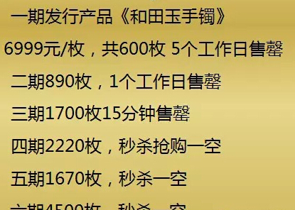 便可獲得下一期配送原始股的資格。(越早完成打量,越早獲得配額資格)。截至目前為止,和田碧玉手鐲已經發售了6期,情況如下: