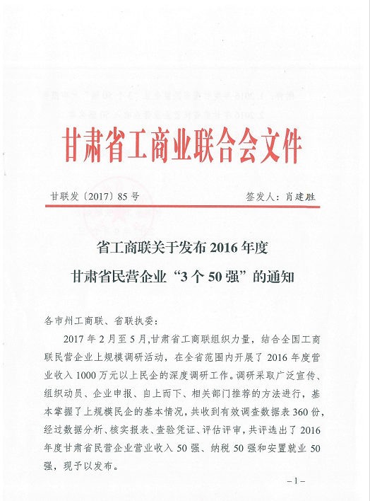 據了解,2017年2月至5月,甘肅省工商聯組織力量,結合全國工商聯民營企業上規模調研活動,在全省范圍內開展了2016年度營業收入1000萬元以上民企的深度調研工作。調研采取廣泛宣傳、組織動員、企業申報、自上而下、相關部門推薦的方法進行,基本掌握了上規模民企的基本情況,共收到有效調查數據表360份,經過數據分析、核實報表、查驗憑證、評估評審,共評選出了2016年度甘肅省民營企業營業收入50強、納稅50強和安置就業50強。