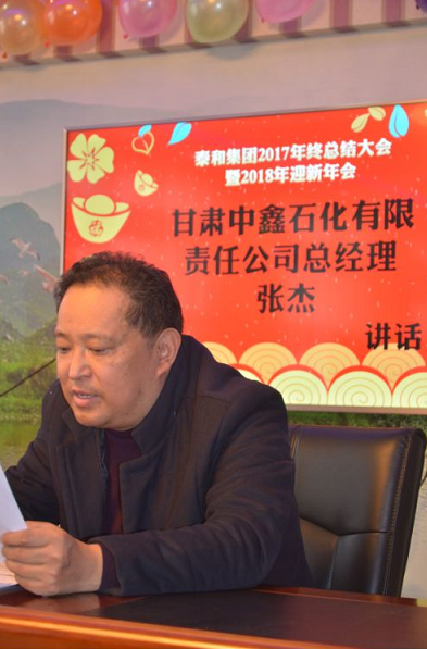總經理張杰致辭,他表示2017年在石油化工方面,經過大家近一年的努力,生產銷售都已進入正軌,2018將是充滿機遇的一年,通過狠抓落實,規范管理,嚴把質量關,做到油滿庫滿,為公司創造更大的利潤。