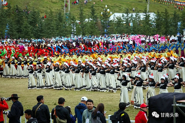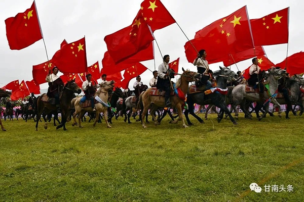 上午10時許,隨著高云龍宣布第二十屆九色甘南香巴拉旅游藝術節開幕,由千匹駿馬、千名騎手組成的馬隊如騰飛的巨龍一般從主席臺前飛馳而過,象征著偉大祖國從站起來、富起來到強起來光輝歷程的71面五星紅旗在會場迎風飄揚……