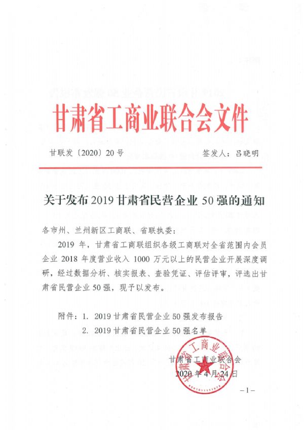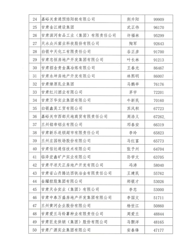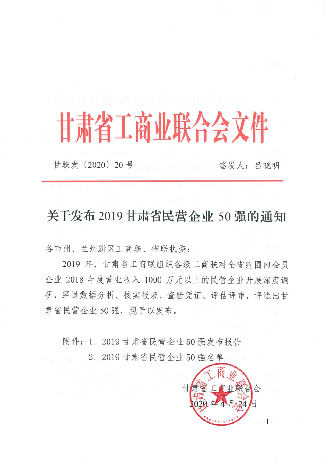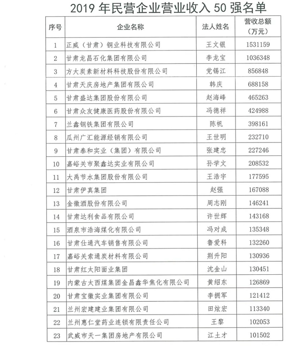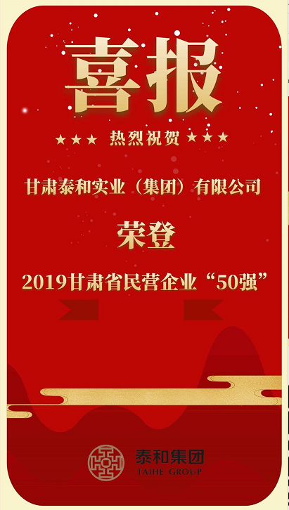 會議上,省工商聯發布了甘肅省2019年度民營企業營業收入50強榜單。甘肅泰和實業(集團)有限公司榮居2019年甘肅省民營企業營業收入50強第9位。